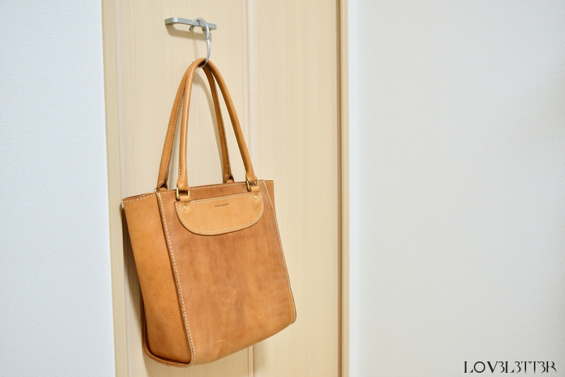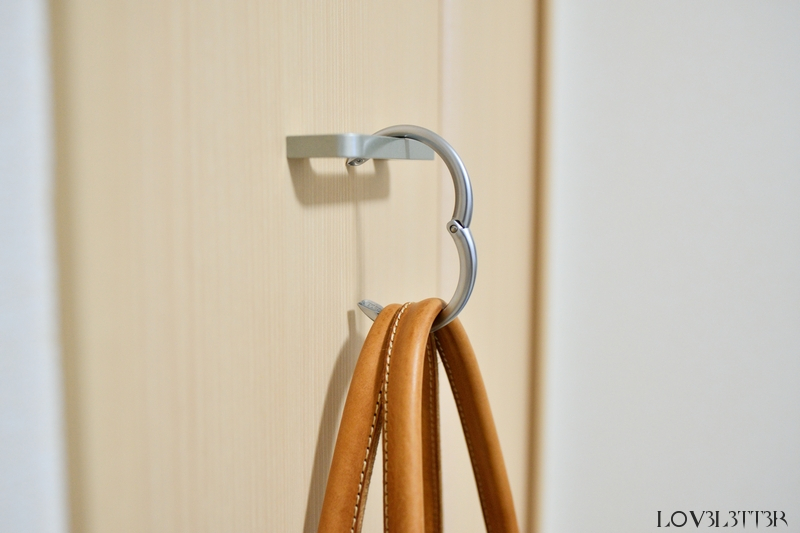 こうやって把手とか椅子の背もたれとかテーブルのフチに引っ掛けることでバッグの底面を床につけずに済みます。