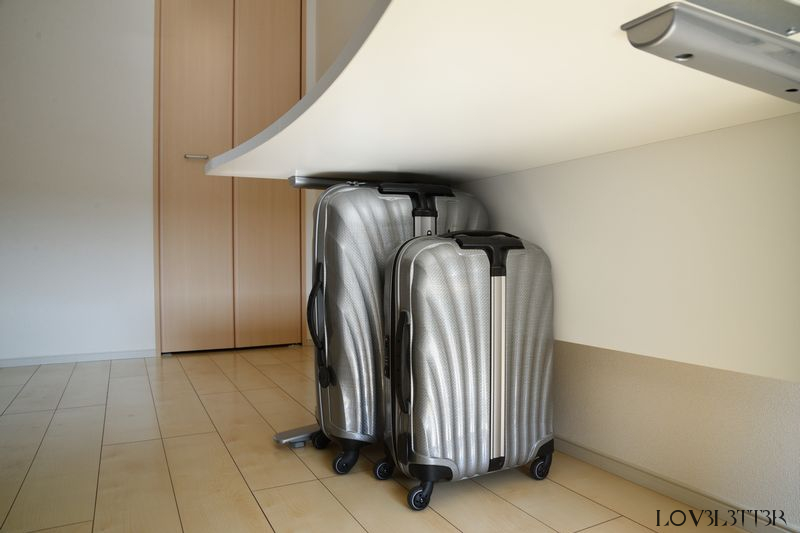 床からデスクの天板までは710mmなのでSamsonite コスモライト スピナー 69cmがちょうど良い感じに納まります。狭い賃貸マンションだとスーツケースの置き場に困るのでありがたいです。