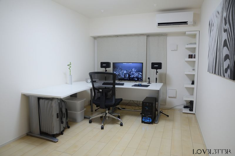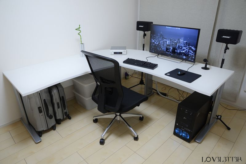 部屋は7.7畳の1Kなのであまり広くありませんが、デスクはでかい方が色々捗るので、Tvilum-Scanbirk デスク 80902 ホワイトを2つとTvilum-Scanbirk デスクトップ 80458 ホワイトを組み合わせて2000×2000のL字型デスクにしました。3つで50Kぐらいでした。左側の何も物を置いてない側でご飯食べたり、作業したりしてます。