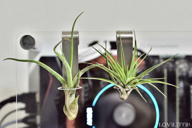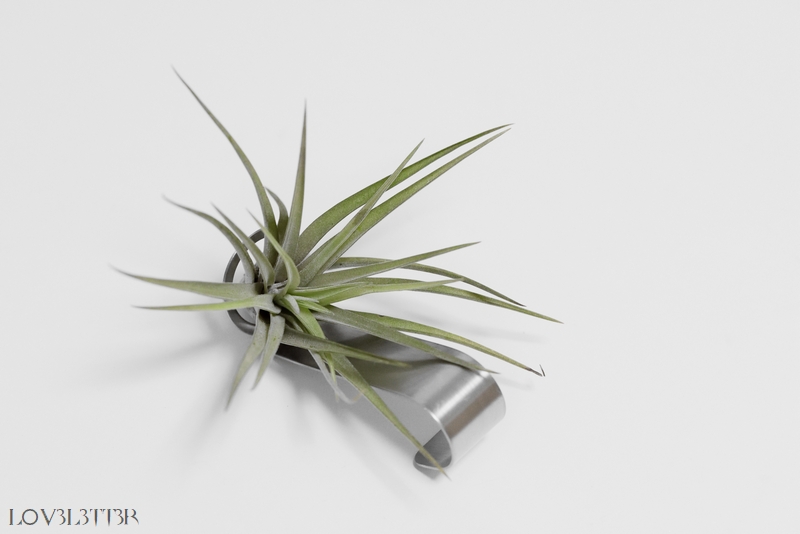 木にワイヤーで括り付けたり、ガラスの瓶や貝殻に入れる人も多いと思いますが、私は植物の緑にはシルバーが一番合う気がするので、ステンレスのヘアラインのスタンドにしました。